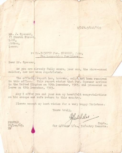 A letter confirming John Spencer's repatriation. Copyright: Brian Finch.