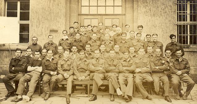Patients pose for a photograph outside the hospital. On the front row, fourth from the right, sitting just behind the third and fifth faces, is Jean O'Brien. Private Ernest John Twycross, 5th Queen's Own Royal West Kent Regiment, captured at Dunkirk on the 14th June 1940, is the amputee sitting third from the right on the front row; he was repatriated to the UK on the 25th October 1943. Copyright: Roger O'Brien.