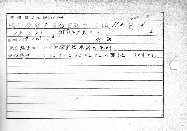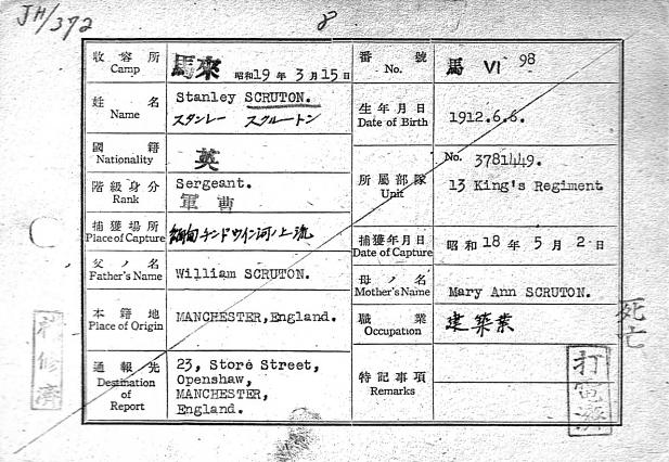The index card of Sergeant Stanley Scruton. He died in Rangoon on the 13th May 1943. The diagonal line drawn through his record indicates his death. Courtesy of Steve Fogden.