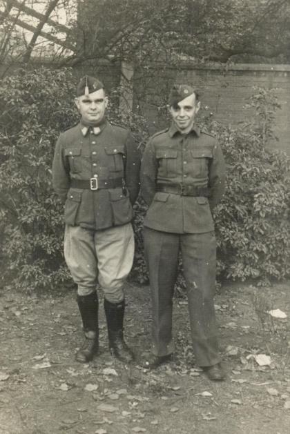 Two Belgian prisoners of war, taken on the 7th February 1942. The reverse side of the photograph has the following note: "J'espère que vous ne me trouverez pas trop changé, grossi un peu suis avec un camarade de Namur." which translates as "I hope you'll not find me too much changed. I have gained a little weight, I am with a friend from Namur." Copyright: Richard Frognier.