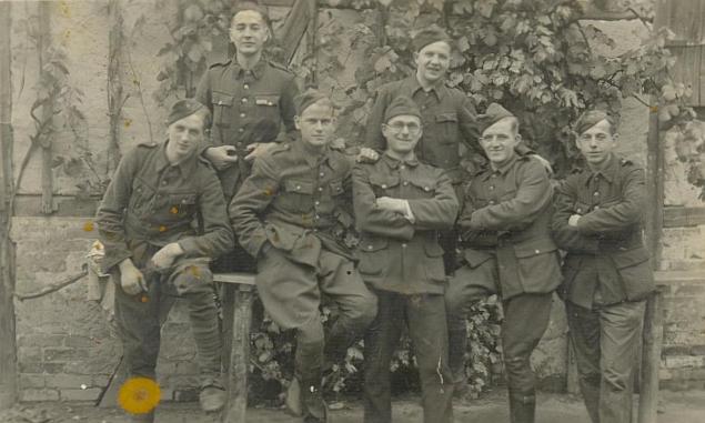 Belgian prisoners of war. Jean Pierre Brack, of the 1st Régiment de Chasseur Ardennais, captured on the 28th May 1940, stands second from the right on the front row. Copyright: Richard Frognier.