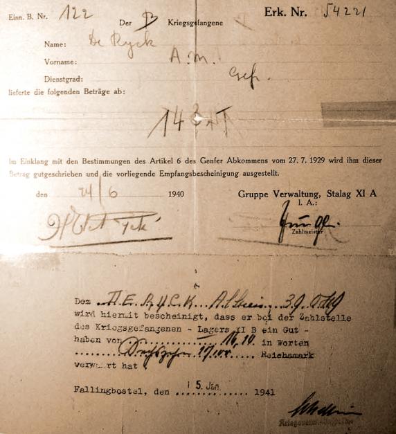 A document concerning payment for work carried out by Marcel De Ryck as a prisoner of war. Copyright: Relatives of Marcel De Ryck.
