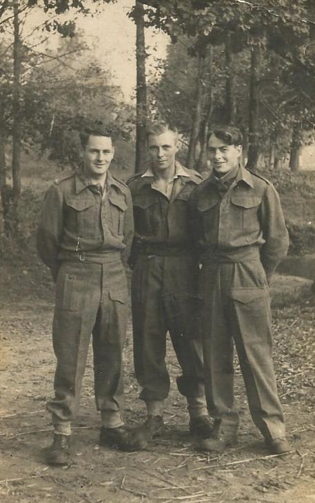 Jack Osborn (centre) on a postcard which he sent to his mother in February 1943. He enlisted on the 16th May 1939 and was posted to the Queen's 131st Surrey Brigade. He was taken prisoner at St Valery en Caux around the 16th June 1940, and spent most of his captivity in Stalag XXA, working in a forest and looking after a bullock cart and piercing the lids of tins of milk destined for the Eastern front. He spent some time on bread and water in solitary for such low level sabotage. He participated in the Long March of 1945 and passed away in 1980, in Adelaide. Copyright: John Osborn.