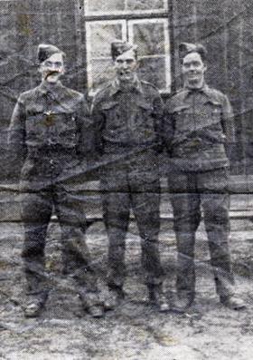 Frederick Nicholls (centre) at Arbeitskommando 179, a work camp attached to Stalag XXA. This photograph was included in a newspaper with the following, "A few days ago Mr. and Mrs. C. Nicholls, of 94, Lower Murston, received this photograph from their youngest son, Pte. Frederick Nicholls, who is a prisoner of war at Stalag XXA (.179), Germany. He is in the centre. In an accompanying letter he says that he is '''in the pink," and that although there are only twenty of them on the farm where he is working, they get some good entertainment, and that he is with a fine lot of lads. Before joining up Fred, who is twenty-two years old, worked in the Sittingbourne Paper Mills. His family are comforted by the very nice letters they have had from him." Copyright: Elaine Nicholls.