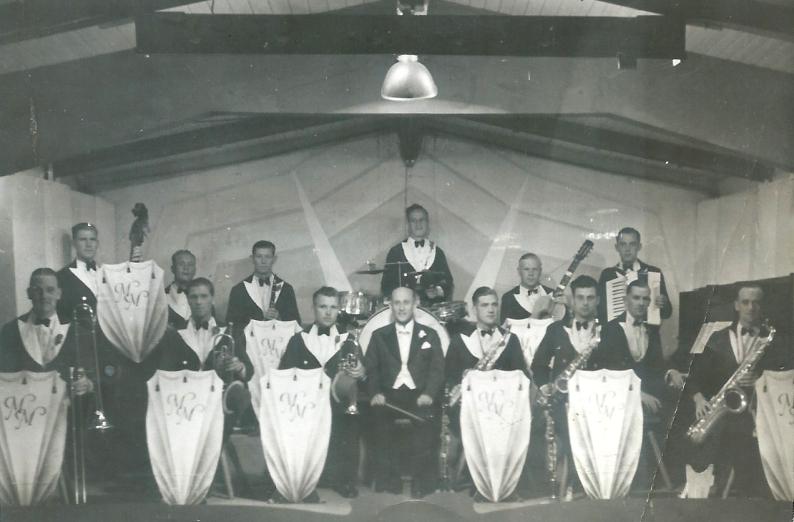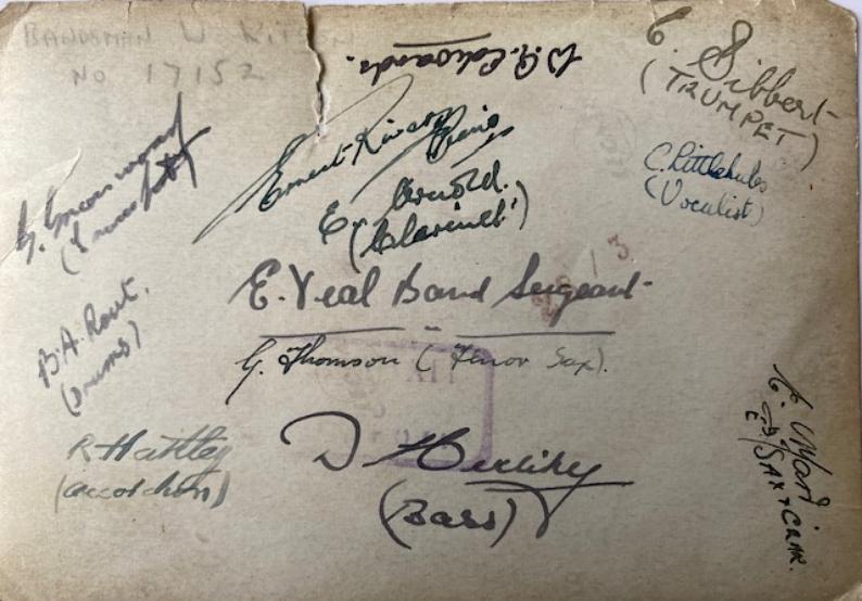 The reverse of a duplicate postcard, signed by the band. The names are: Edward "Ted" Veal (Band Sergeant), William Arthur Kitson (Trombone), Bill Greenwood, R. Hartley (Accordion), G. Thompson (Tenor Sax), B.A. Rout (Drums), E. Arnold (Clarinet), Ernest Sibbert (Trumpet, of The Kings Own Royal Regiment, POW 12454), D. Buckley? (Bass), Ernest Rivers (Piano), C. Littlehales (vocalist), W.G. Edwards, E ?ard (Saxophone and clarinet). Copyright: John Adams.