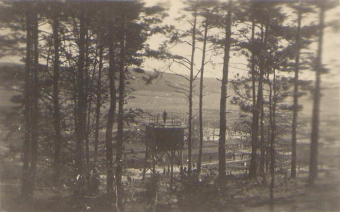 Looking through the woods to a watchtower. Photograph taken from the diary of CSM "Mac" Maclaren. Thanks to Chris Moscrop chrisanniemoscrop@gmail.com.