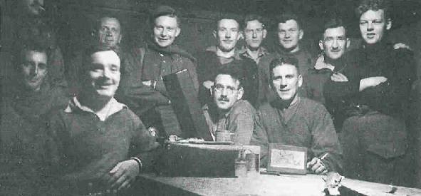 The occupants of Hut 201 in 1943. Occupants include Fred Stuckey (top left, half face visible with cigarette), Ginger Suggit (standing 3rd from left), and George Beeson (standing 2nd from right). The others may include Archie McKee, Bert Howe, Bob Jordan, Ned Lynch, Ted Hardman and Alex Shelton.