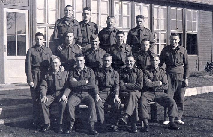 Possibly taken in Arbeitskommando 404. Sergeant Benjamin Francis of the Royal Artillery, captured in Crete, is seated at the far right on the front row. When the camp was being evacuated as Allied forces drew near, Francis and another man hid in the rafters of their hut and were subsequently freed. Copyright: Geoff Francis.