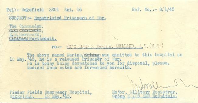 A note confirming Marine Albert Mullard's admission to hospital in Britain after his repatriation in May 1945. Copyright: Karl Flavell.