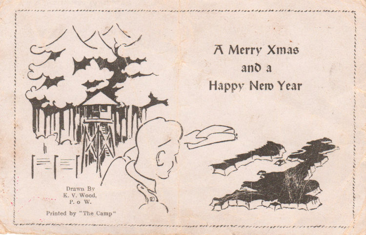 A Christmas card printed in "The Camp" magazine; as such, although it is from the collection of a prisoner in Stalag IIID, it may have been drawn elsewhere. Larger image. Copyright: Denis Ward.