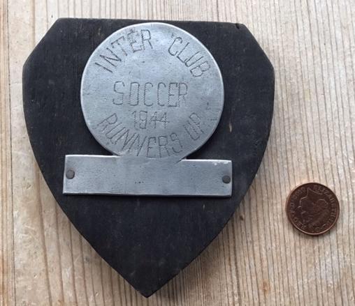 The Football Inter Club Runners Up plaque, 1944. The metal component was salvaged from Red Cross tins. Copyright: J Daly, Secretary of IVB Ex POW association from 1967 to 1997.