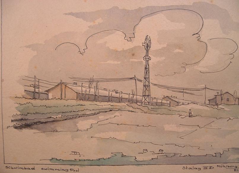 A drawing of the swimming pool area by a Dutch prisoner of war. The original picture is for sale, if you are interested in purchasing it, contact the owner at vandenhoute@planet.nl