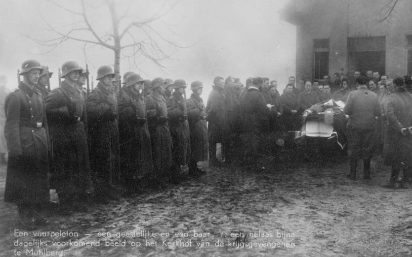 The funeral of a prisoner at Mühlberg churchyard. The photograph was one of several taken by a Dutch prisoner, N. Uchtmann, who turned his pictures into postcards after the war.