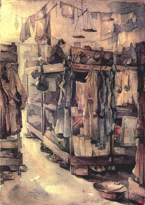 A painting showing living conditions inside a barrack hut, by Dutch artist Wim van Hooff. Copyright: Rijksmuseum Amsterdam The Netherlands.