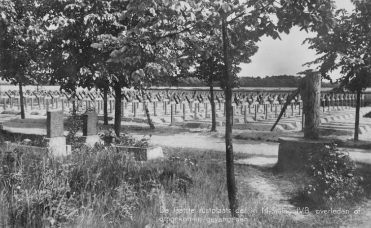 The graves of men who died in IVB. The photograph was one of several taken by a Dutch prisoner, N. Uchtmann, who turned his pictures into postcards after the war.