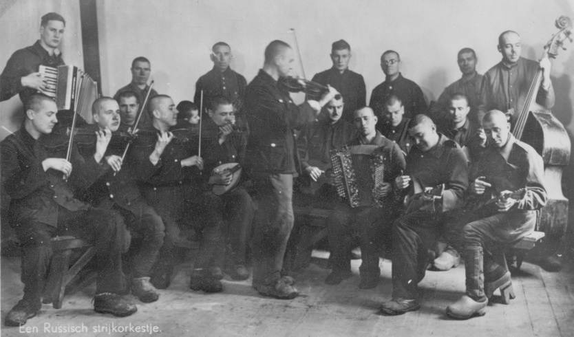 The Russian string orchestra. The photograph was one of several taken by a Dutch prisoner, N. Uchtmann, who turned his pictures into postcards after the war.