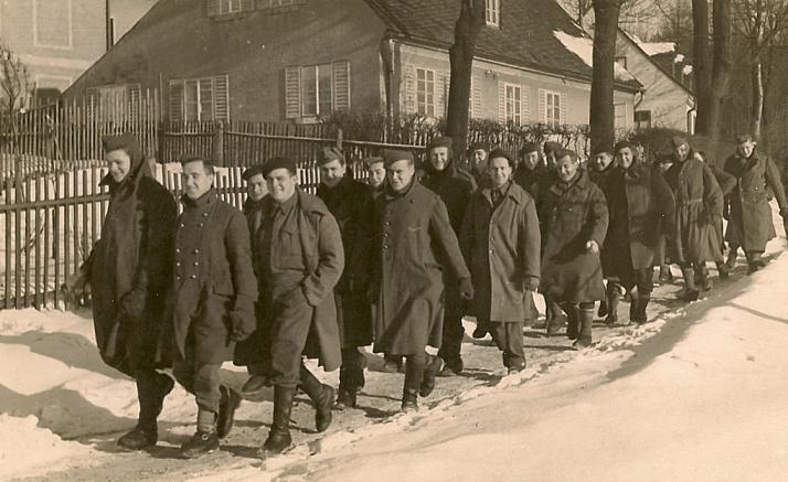 British prisoners of war marching through the snow. Charlie Kedge, captured in Crete, 1942, is at the front of the group. Copyright: Pam Perry.