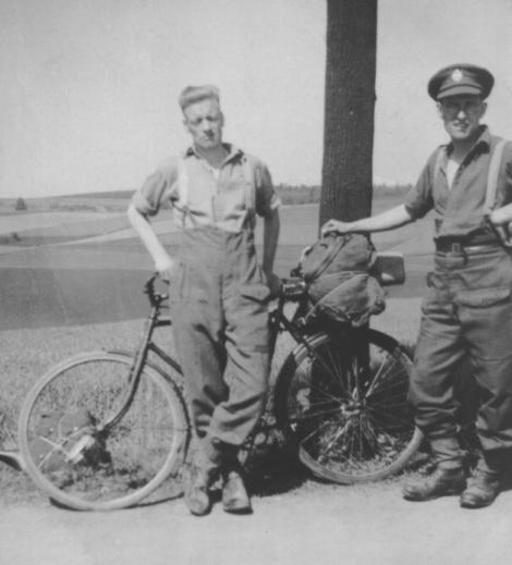 Gilbert Knott (right) and Cyril Randall on the 12th May 1945, making their own way to the western Allied lines on bicycle. Copyright: Phil Knott.