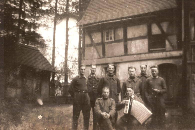French prisoners of war at a farm attached to Stalag IVF. Joseph Lecrivain holds the accordion. Born in 1919, he was captured on the 18th June 1940, and, after spending the remainder of the year at Rouen, he was transferred to Stalag IVF where he spent the rest of the war. Joseph Lecrivain died in the Paris region in 1999. Copyright: Alain Lecrivain.