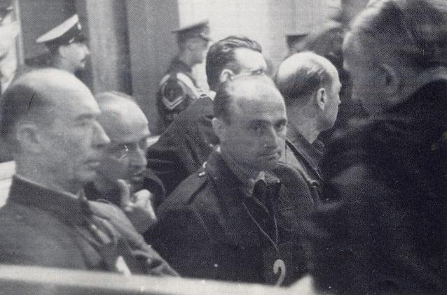 Max Wielen (far left) and Emil Schulz (centre) on trial for their part in the murder of The Fifty, along with 16 other Gestapo officials. Schulz was accused of the murder of Squadron Leader Roger Bushell, the mastermind of the Great Escape. He was found guilty and hanged. Copyright: The Hulton-Deutsch Collection.