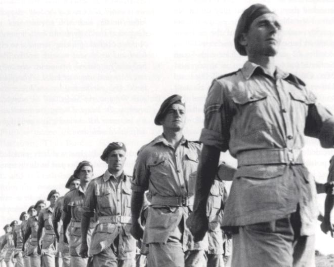 Men of No.1 Platoon, 9th Field Company marching off after the Church Parade on the 4th July 1943. Right to left: Corporal J. Wharton, Lance-Sergeant B. Cawood, Sappers J. Saunders, G. Price, H. Jones, and A. Beardall. Copyright: IWM NA4004.