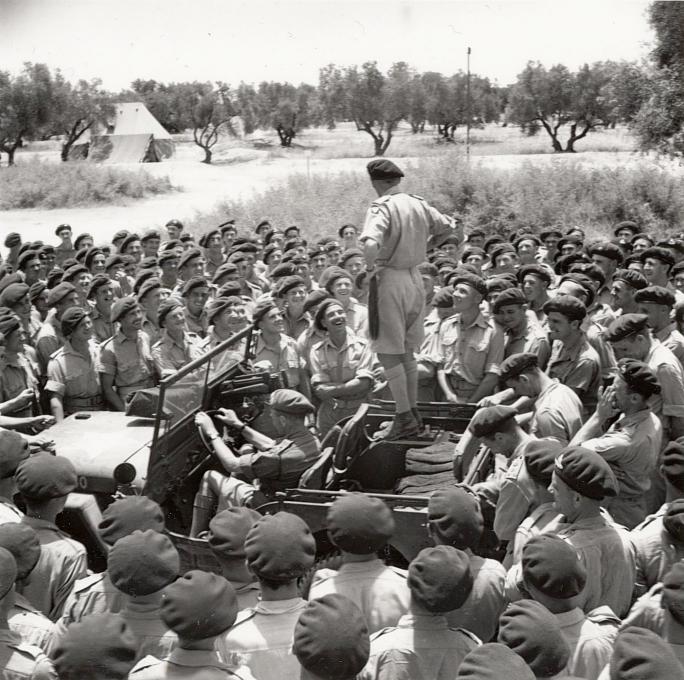 General Montgomery giving one of his trademark addresses to men of various units of the 1st Airborne Division, near Sousse, on the 9th July 1943. Standing amongst the crowd, sporting a moustache two heads above the man standing at the corner of the bonnet of the jeep, is Private Bob Stevenson of the 2nd Parachute Battalion. The photograph was taken by Lieutenant Meakin. Copyright: IWM NA4063.