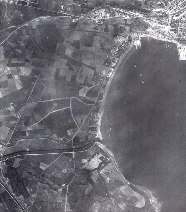 An aerial photograph taken on the 1st May 1943, with the top of the photograph facing north, showing part of Syracuse (top right) and the Ponte Grande bridge (towards the bottom, just left of centre). Running from left to right, the River Anapo (above) and Canal Mammaiabica (below) can clearly be seen under the bridge. At the extreme left of the picture the railway bridge can also be seen; the long straight line proceeding north-north-east from the Canal is the railway line. Only the eastern sector of LZ-3 can be seen in this photograph, running from west to east between the railway and the Ponte Grande bridge, and about half the distance between these to the south of the Canal. Photographs such as this one made it appear as if the zone was an open space, empty of obstacles and therefore ideal for glider landings. A closer look, however, would have revealed an imposing network of low stone walls. Copyright: Taylor Library.
