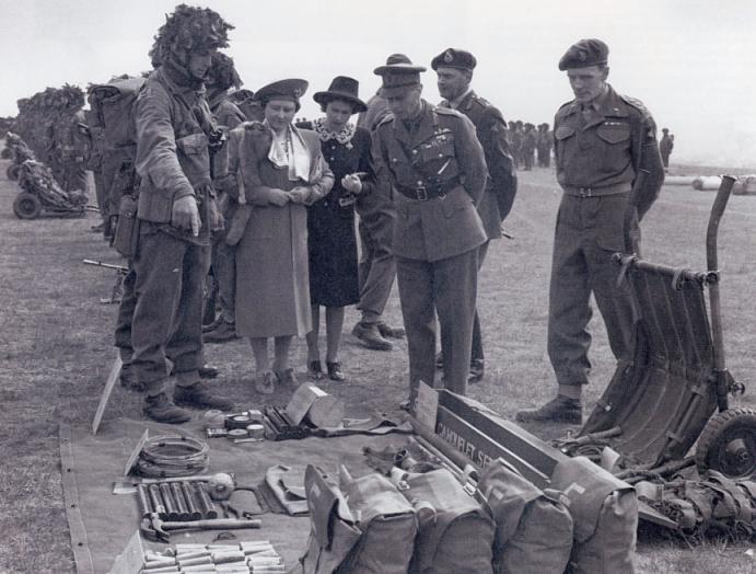James Hill (far right) during a Royal visit on the 19th May 1944. The officer of the 3rd Parachute Squadron on the left is explaining demolition charges to King George VI, Queen Elizabeth and Princess Elizabeth. In the background, to the left of James Hill, is Major-General Richard Gale. Copyright: Imperial War Museum.