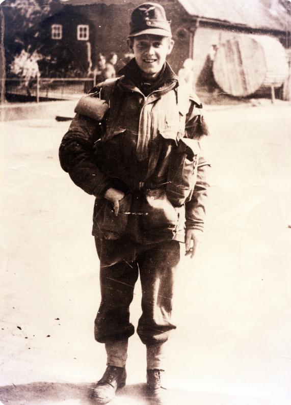Sergeant John McCarter of "F" Squadron, The Glider Pilot Regiment, wearing a German cap in what is almost certainly Hamminkeln: the barrel structure in the top right bears a striking similarity to the same in this photograph. The photo was taken by Sergeant Christie of the Army Film and Photographic Unit. Copyright: Imperial War Museum.