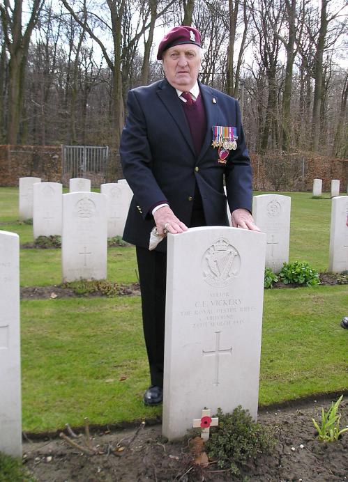 Lance Rooke at the grave of Major C. E. Vickery, his former company commander, at the Reichswald Cemetery, 31st March 2010, the 65th anniversary of the Rhine Crossing.