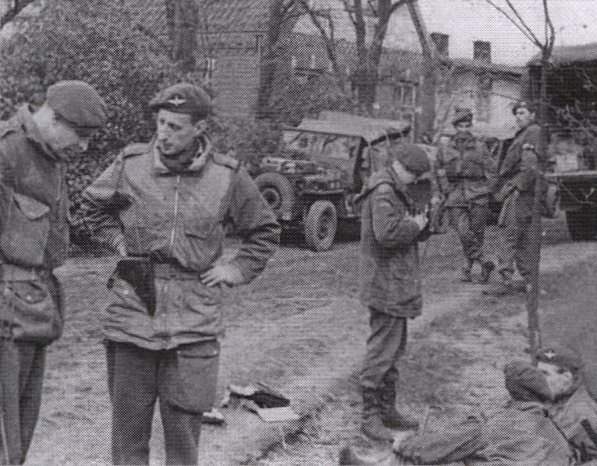 Brigadier Poett (extreme left) talking with Lieutenant-Colonel Pine-Coffin in Normandy.