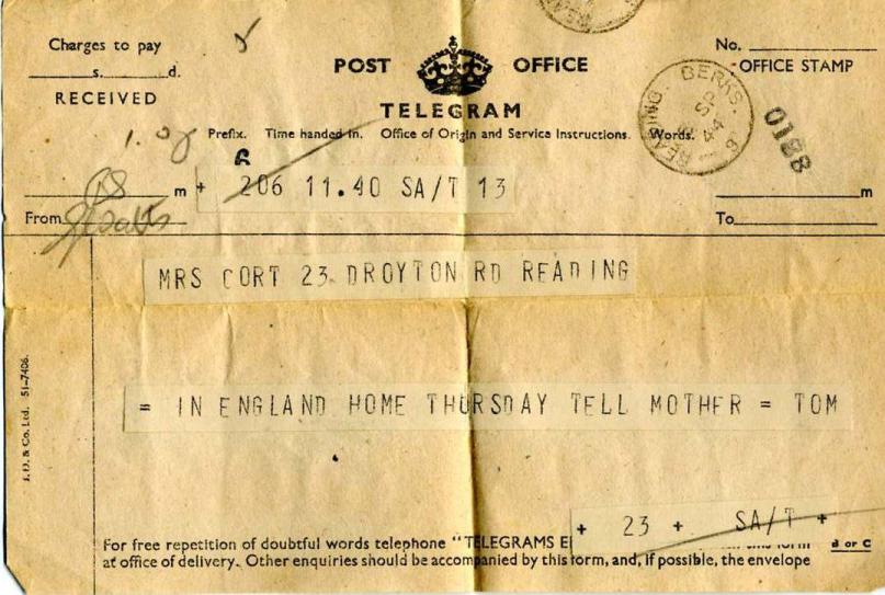 A telegram sent home by Tom Stevens in September 1944 to let his sister know that he was coming home from Normandy. He had sent it to her as he did not want his wife to receive it and think he had been killed. Copyright: Dave and Helen Ewers.