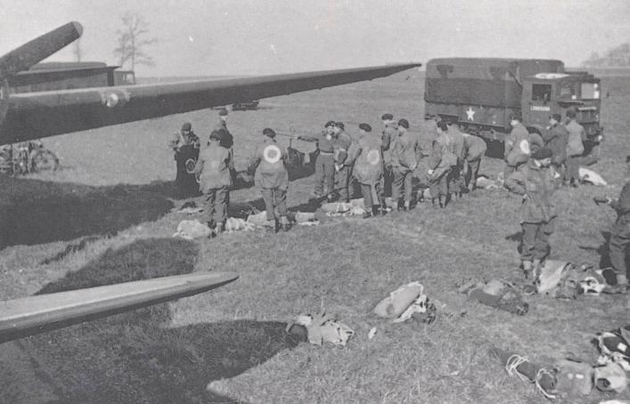 Men of the 8th Parachute Battalion preparing equipment beside their aircraft at Chipping Ongar. Copyright: Imperial War Museum.