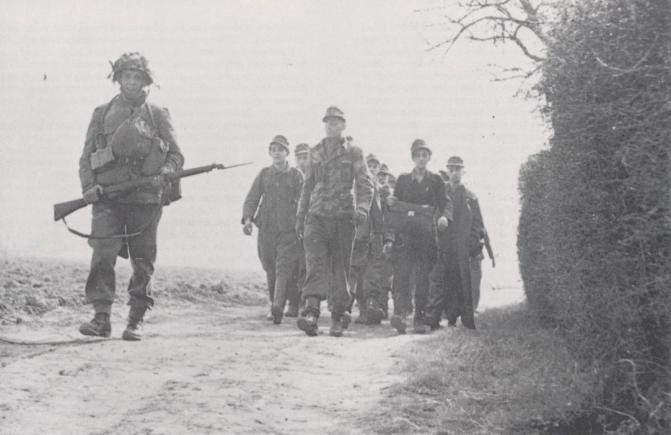 A British NCO leads one of the first groups of captured Germans towards the POW cage. Copyright: Imperial War Museum.