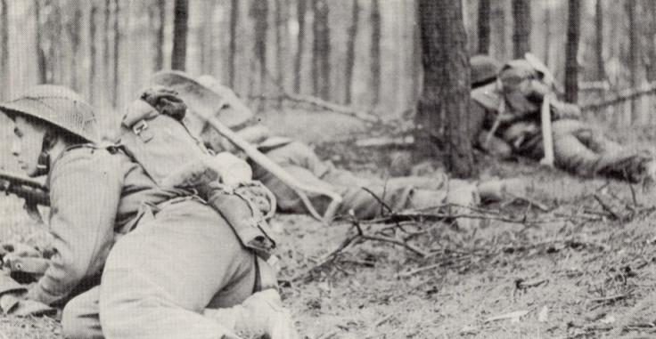 Men of the 15th (Scottish) Division take cover after coming under fire from a sniper. Copyright: Imperial War Museum.