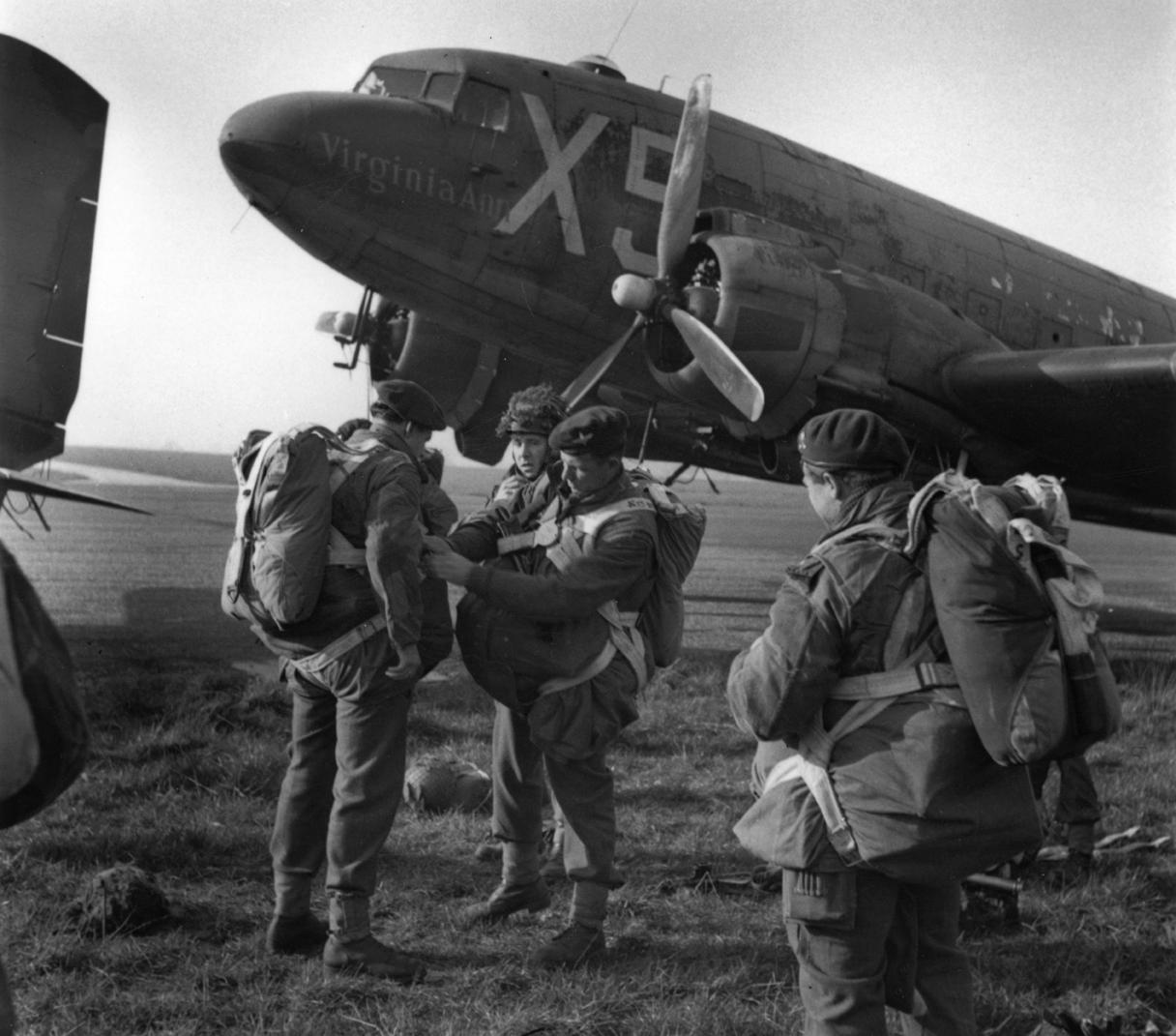 Men of the 3rd Parachute Brigade fitting parachutes at Chipping Ongar. The C-47 behind, the "Virginia Ann", is of the 59th Troop Carrier Squadon, 61st Troop Carrier Group, 52nd Troop Carrier Wing. Larger image. Copyright: IWM FRE 003383.