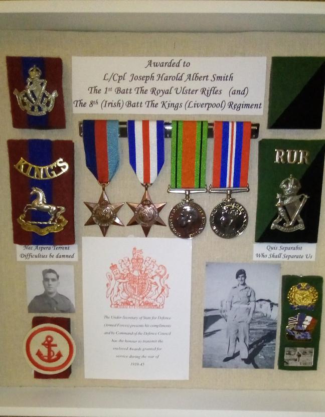 3782603 Lance-Corporal Joseph "Smudger" or "Johnny" Smith, at Nathanya, Palestine, 1945. Joseph Harold Albert Smith, son of Harold Sidney and Rebecca Jane Smith, nee Edgar, was born in Everton, Merseyside, on the 7th December 1922. His profession at the age of 18 was recorded as Pawnbroker's Assistant. He enlised in the Army at Liverpool on the 25th April 1941, and was posted to the 70th Battalion The King's Regiment, then on the 7th January 1943 transferred to the Lancashire Fusiliers, before joining the 8th (Irish) Battalion The King's (Liverpool) Regiment on the 3rd April 1943. It was with the 8th Battalion that he landed on Juno Beach on the 6th June 1944; the Battalion spent six weeks here at part of the 7th Beach Group before being disbanded, and on the 21st July 1944, Smith joined the 1st Battalion The Royal Ulster Rifles. He served with them throughout the remainder of the Normandy campaign, and later in Belgium, Holland, and Germany, by which time he had been promoted to Lance-Corporal, and also in Palestine from the 1st October 1945 to the 5th September 1946, during which time he represented the Battalion at football and acquired a considerable collection of photographs, reproduced here. Smith was discharged from the Army on his return to the UK, having been awarded the 1939-1945 Star and the France/Germany Star, Defence Medal, and the War Medal 1939-1945. He married Rebecca Susan Snell on the 26th November 1949, having become acquainted with her through the marriage of her sister to his close friend, Sidney Everitt, with whom he had served in the 1st Royal Ulster Rifles. His son, Steve, was born on the 19th July 1954. Joseph Smith died on the 6th January 1963. Copyright: Steve Smith.