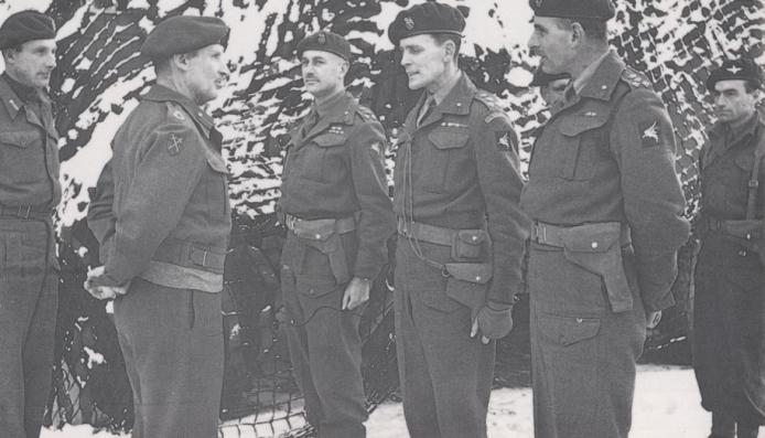 Field Marshal Montgomery with senior officers of the 6th Airborne Division during the Battle of the Bulge in January 1945. Left to right: Major-General Eric Bols (CO 6th Airborne Division), Field Marshal Montgomery, Brigadiers Edwin Flavell (6th Airlanding Brigade), James Hill (3rd Parachute Brigade), Nigel Poett (5th Parachute Brigade), and Lieutenant-Colonel Napier Crookenden (CO 9th Parachute Battalion). Copyright: Imperial War Museum.