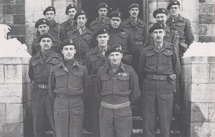 Field Marshal Montgomery with senior officers of the 6th Airborne Division in the Ardennes, January 1945. Left to right, back row: Lieutenant-Colonels Napier Crookenden (9th Battalion), Paul Gleadell (12th Devons), Gerald Ford, Michael Roberts (GSO-1 (Ops), Divisional HQ), and Major Archie Bookless (Adjutant, 8th Battalion). Middle row: Lieutenant-Colonels Kenneth Darling (12th Battalion), Geoffrey Pine-Coffin (7th Battalion), Jeff Nicklin (1st Canadian Battalion), and Peter Luard (13th Battalion). Front rows: Brigadier Edwin Flavell (6th Airlanding Brigade), Major-General Eric Bols (Commander, 6th Airborne Division), Brigadier James Hill (3rd Parachute Brigade), Field Marshal Montgomery, and Brigadier Nigel Poett (5th Parachute Brigade). Copyright: Imperial War Museum.
